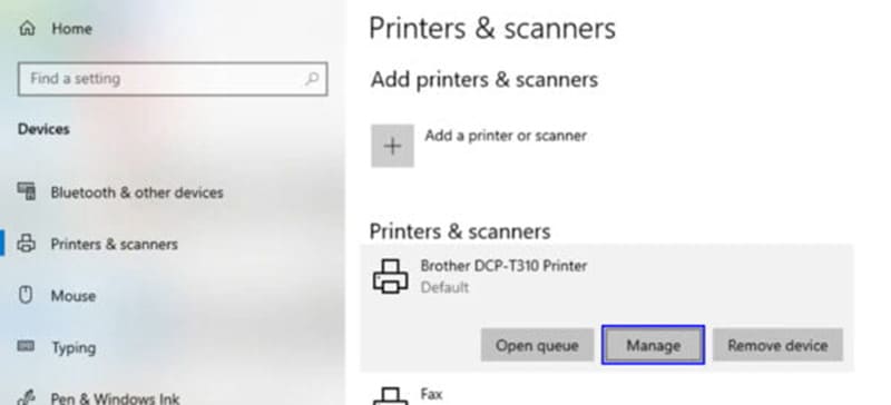 Bước 2: Tìm máy in Brother trong danh sách thiết bị > nhấp chuột phải > chọn Manage.