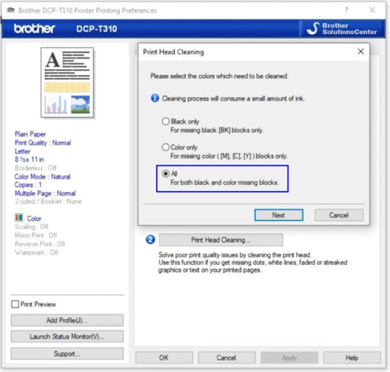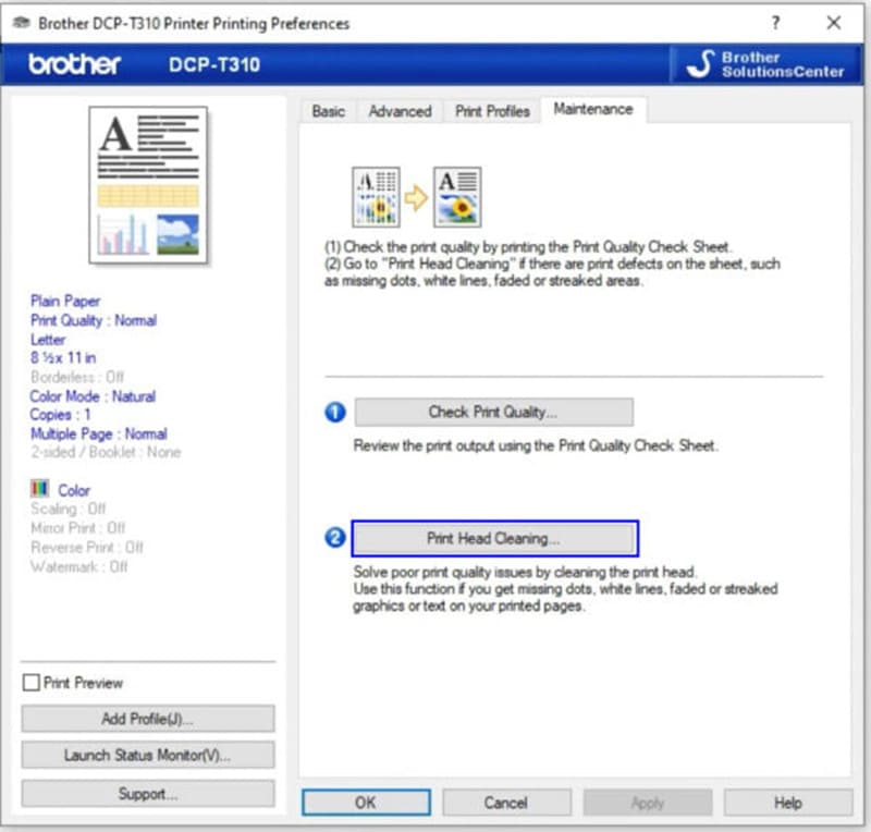 Hầu hết các máy in phun Brother đều có tính năng tự làm sạch đầu phun. Điều này giúp người dùng có thể vệ sinh máy nhanh chóng, dễ dàng chỉ với vài thao tác. Các bước thực hiện rất đơn giản như sau: