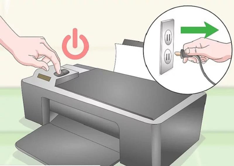 Bước 1: Trước khi thao tác, hãy tắt máy in và rút dây nguồn ra khỏi ổ điện. Điều này giúp đảm bảo an toàn cho bạn và tránh hư hỏng linh kiện.