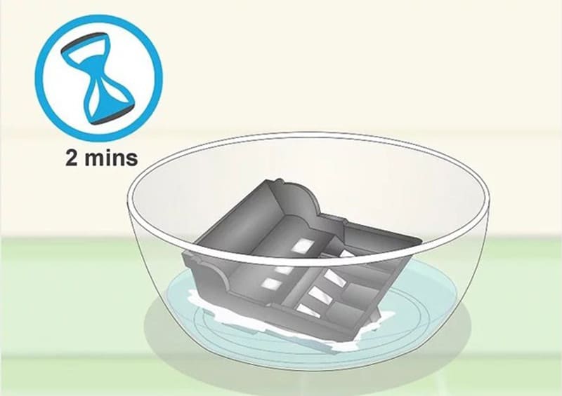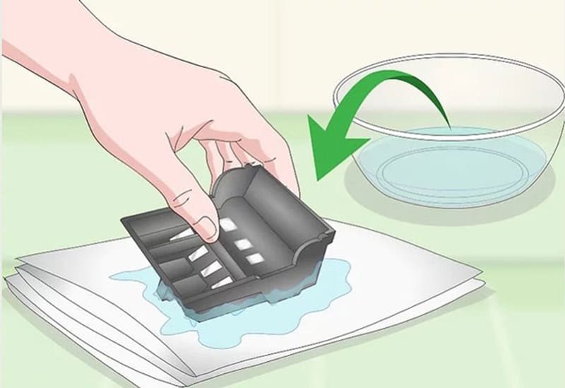 Bước 5: Đặt đầu phun vào hỗn hợp vừa pha trong khoảng 2–3 phút để làm mềm và loại bỏ mực khô hoặc bụi bẩn tích tụ.
