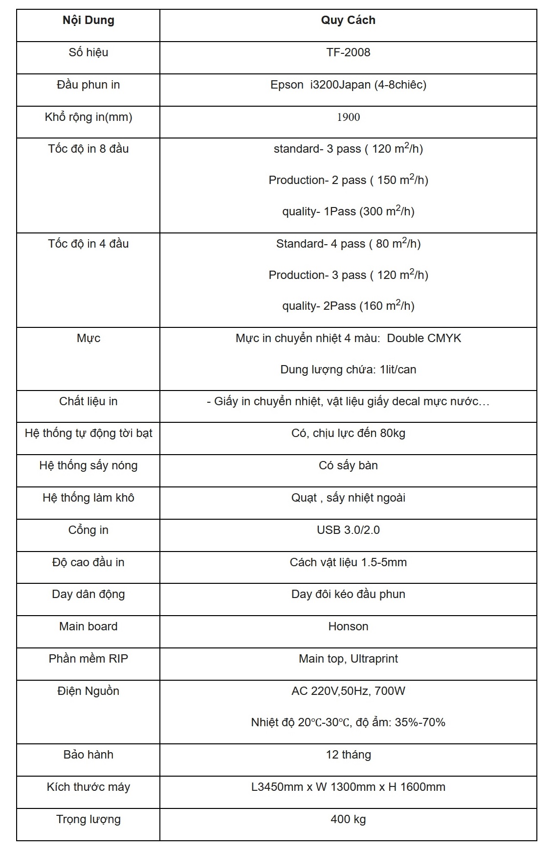 - Máy sử dụng 08 đầu in Epson i3200, cho ra tốc độ nhanh hơn 200m2/h