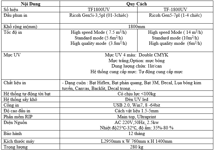 Máy in uv cuộn Taimes TF-1800 sử dụng đầu phun Ricoh Gen5i hoặc Gen5 nhập khẩu trực tiếp từ Nhật Bản có tuổi thọ lâu đời, chất lượng cao, các tia mực phun ra nhỏ, nhanh, đều, mịn. Hệ thống tự động giữ ủ bảo vệ đầu phun giữ cho đầu phun in chất lượng tốt, tăng tuổi thọ đầu phun.Màu sắc tươi chuẩn sống động, độ bền màu tốt.